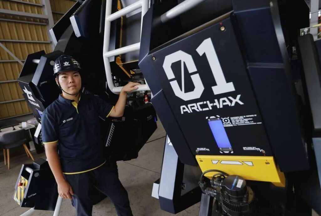این ربات که به نام باستان شناسی دایناسور پرندگان ARCHAX نامیده می شود، دارای مانیتورهای کابین خلبان است که تصاویر را از دوربین های متصل به بیرون دریافت می کند تا خلبان بتواند بازوها و دست ها را با جوی استیک از داخل تنه خود مانور دهد.