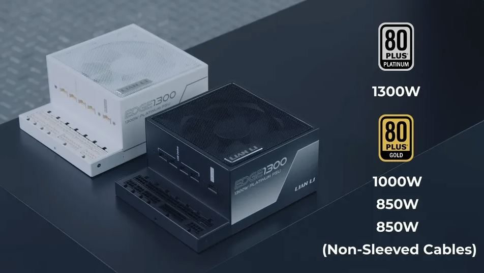 سری جدید Edge شامل چهار SKU است که دارای یک مدل پرچمدار 1300 وات، یک نسخه 1000 وات و دو نوع 850 واتی است، یکی با کابل های پوشیده شده و دیگری بدون سیم پوشیده شده. (نسخههای 1300 و 1000 وات فقط با کابلهای پوشیده شده عرضه میشوند.) سری جدید PSU Lian Li همچنین دارای یک کانکتور برق 12VHPWR و کابل برای تغذیه آخرین پردازندههای گرافیکی سری RTX 40 انویدیا است.